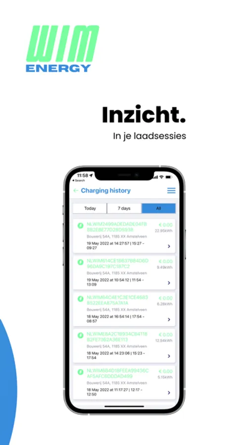 Klanten van WIM Energy kunnen met de app hun laadsessies inzien, en: