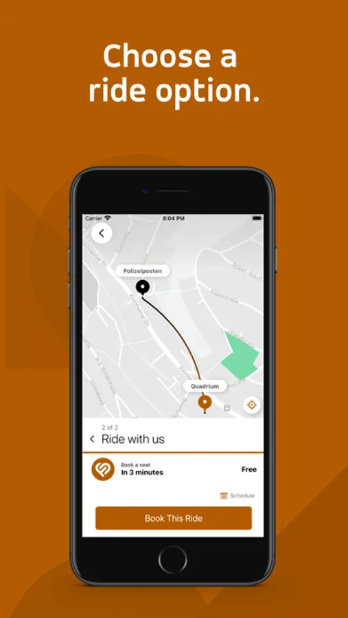 2) Book a ride: Choose your starting point and destination. Your location will be determined automatically, but you can also set addresses manually. You can also enter the number of passengers. You can book rides for several people - even barrier-free. Then select your favorite from the ride suggestions. The app shows you the way to your boarding point, which you can easily reach on foot.