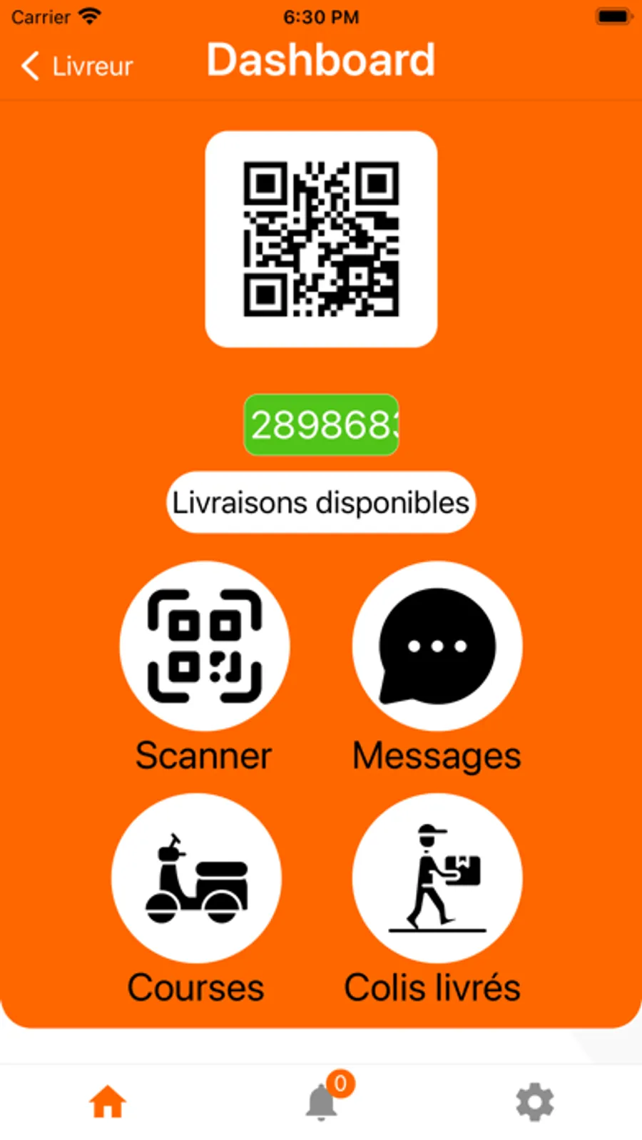 LIVREURS: La fonctionnalité Livreurs permet au livreurs déjà enregistrés sur la plateforme de chercher l'adresse d'un client sur la carte, recevoir des messages, voir leur destination, acheter des QR codes et recevoir des paiements.