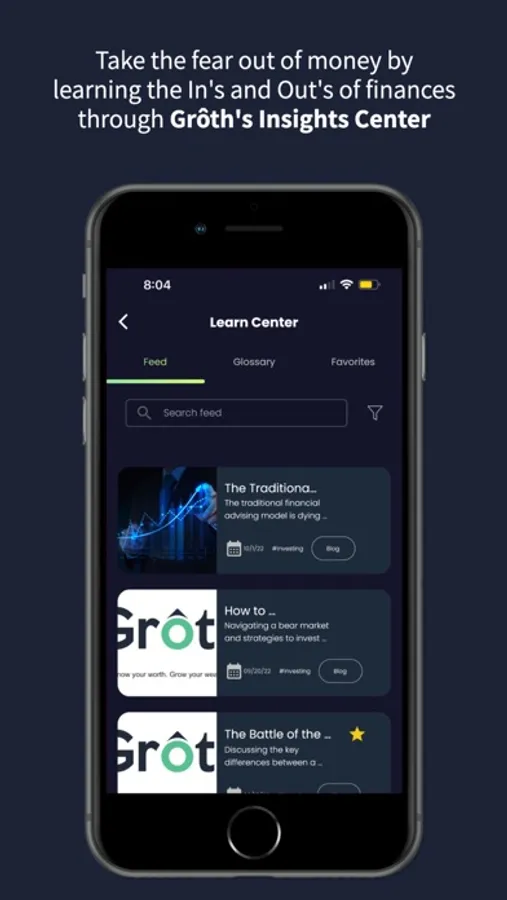 Personal finance can be overwhelming, especially when you're bombarded with jargon and complex concepts. When you sign up for Grôth you will have access to our Insights Center - a resource hub designed to make financial education accessible and engaging. With a diverse collection of blogs, articles and terms it will become your one-stop destination for understanding and mastering your financial journey.