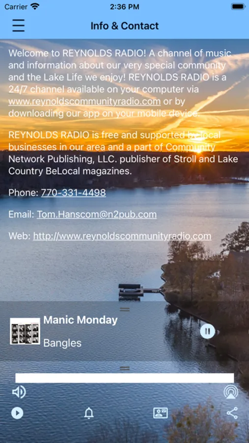 A radio channel featuring music and information for the Reynolds Lake Oconee community. The music blend features Feel-Good Favorite songs from the 70s, 80s, 90s and 00s. The channel provides information about the neighborhood.