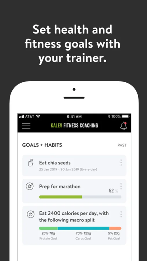 With the Kalev Fitness Coach App, you can start tracking your workouts and meals, measuring results, and achieving your fitness goals, all with the help of your personal trainer.