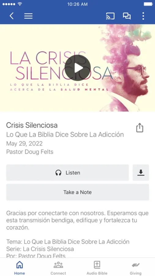 This app will help you stay connected with the day-to-day life of our church. With this app you can: watch or listen to past messages; stay up to date with push notifications; share your favorite messages via Twitter, Facebook, or email; and download messages for offline listening.