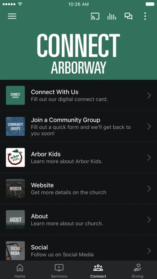 This app will help you stay connected with the day-to-day life of Arborway Community Church. This app will help you watch or listen to past messages, stay up to date with push notifications, share your favorite messages on social media, download messages for offline listening, and watch our weekly live stream. It's also a great way to stay connected to the life of the church through the built-in messaging app. Plus it's easier than ever to support the mission through our giving platform.