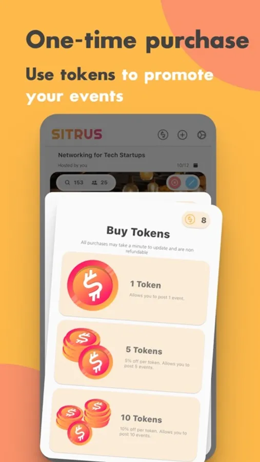 Each event creation and posting costs 1 token. Purchase more than 1 token to get discounts. Unlike other event planner and event management apps, we don’t charge subscriptions. All event organization tokens on our event maker app are a one-time purchase.