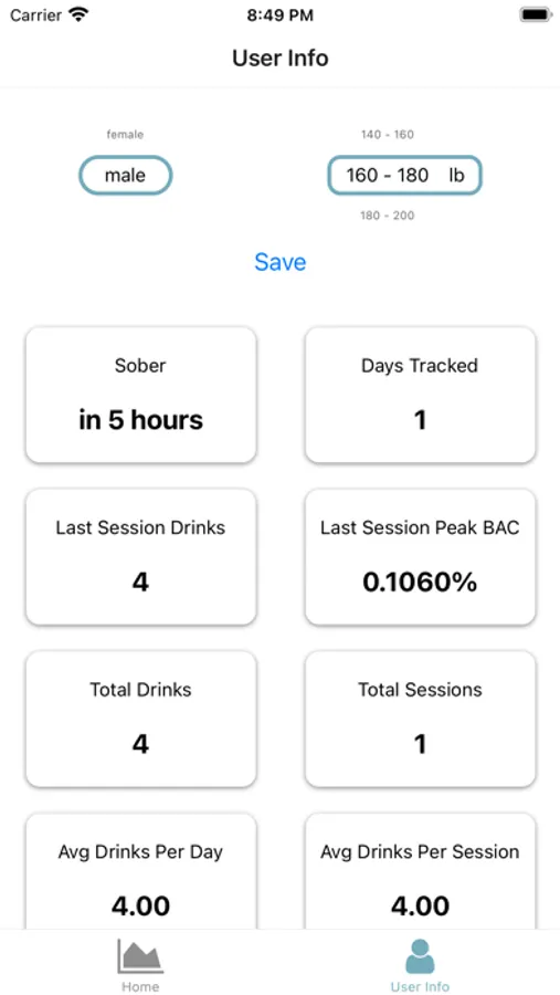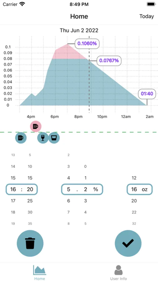 Based on your weight and gender, this drink tracking app uses Widmark's formula to estimate your BAC and display how you metabolize alcohol over time in one simple to understand screen.