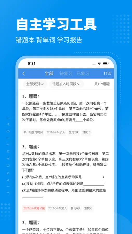 简单一百资源库,按难度分三个层次,家长孩子按需选择,实现“一人一难度,个性化学习”,致力于帮助有需要的孩子花最少的时间解决最急迫的问题。简单一百把“自主学习力,终身竞争力”作为基本理念,期望帮助孩子们能稳步提升自主学习能力。