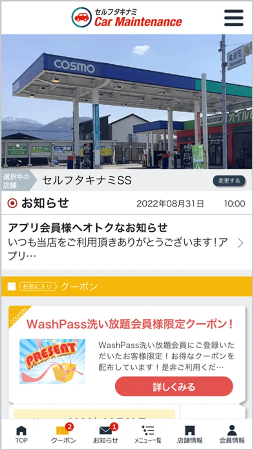 当社の公式アプリ「かつやまアプリ」ではアプリで洗車サービスのご利用が可能の他、当店で利用いただけるお得なクーポンや各種メニューの割引情報を配信しております。
