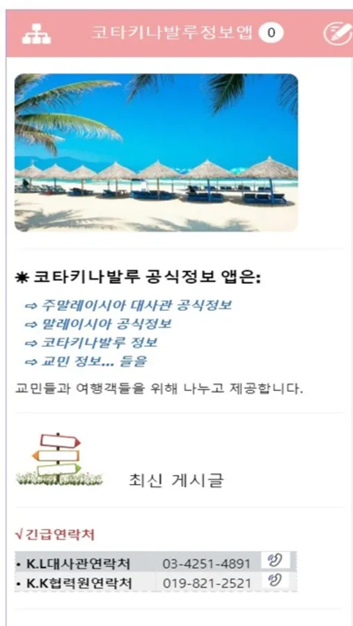 말레이시아 공식정보, 대사관 공식정보, 코타키나발루 공식정보, 교민 생활정보, 여행객 여행정보, 긴급상황 시 긴급연락 정보 등을 제공합니다.