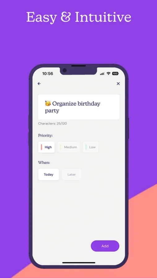 Simply add a task, prioritize it and schedule for today and later. You can drag and drop to-do’s in the list to change the prioritization.