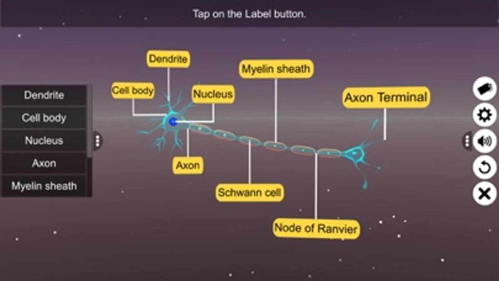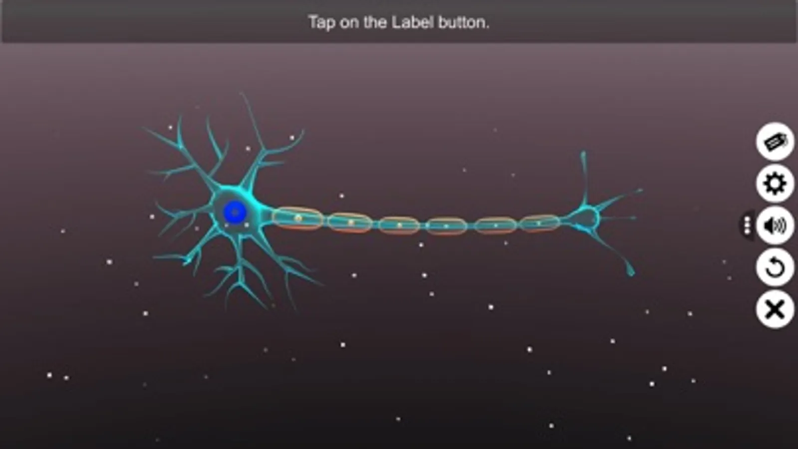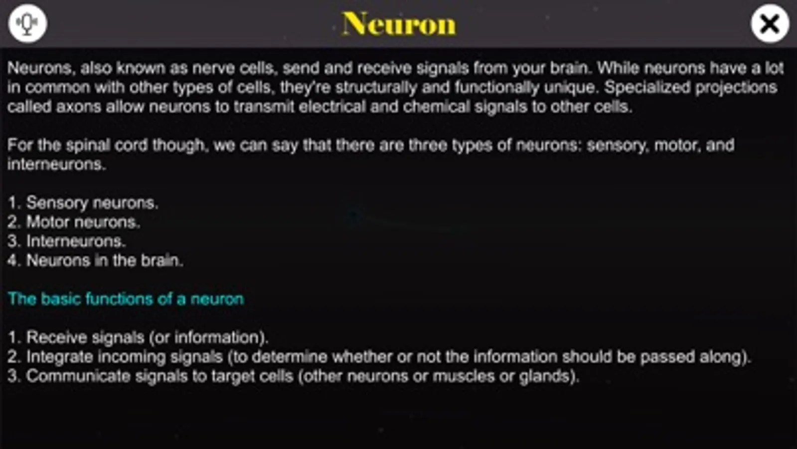 "Experience seamless education with the 'Neuron' app! Dive deep into neuron anatomy by tapping labeled windows, enhancing your understanding. Zoom, rotate, and audio pronunciations offer a comprehensive learning adventure.