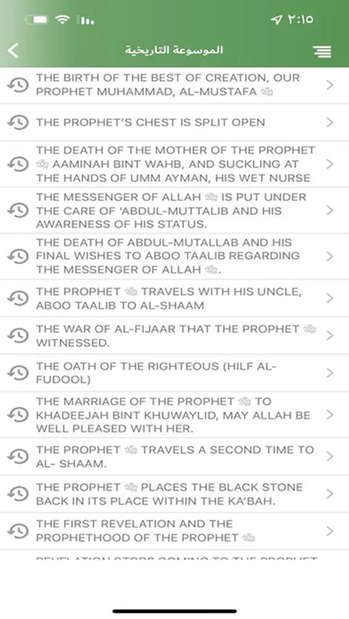 - إمكانية تصفح أحداث السيرة النبوية والخلفاء الراشدين باللغة الإنجليزية.