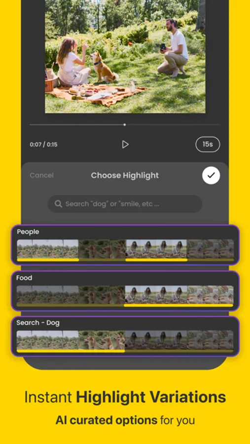 INSTANT HIGHLIGHT VARIATIONS — Discover several stunning AI-generated highlight reel options for your video. Each of these reels clips is specially curated by combining moments in your video based on a theme