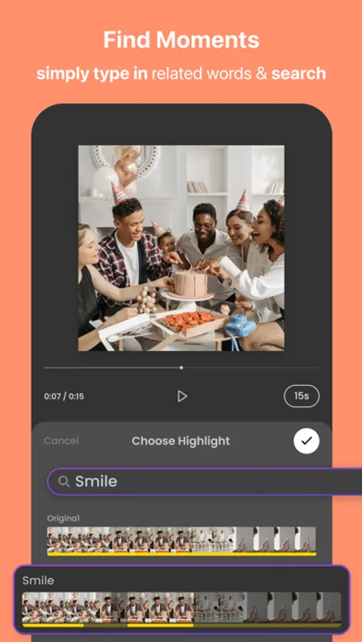 TYPE & SEARCH HIGHLIGHTS — Simply find the moment/object you want to include in the compilation. Try “Food”, “Sunset” or even more specific phrases like “Children running on the beach” or “Hot air balloon in the sky” - HiLite detects them for you so you don’t need to spend time searching