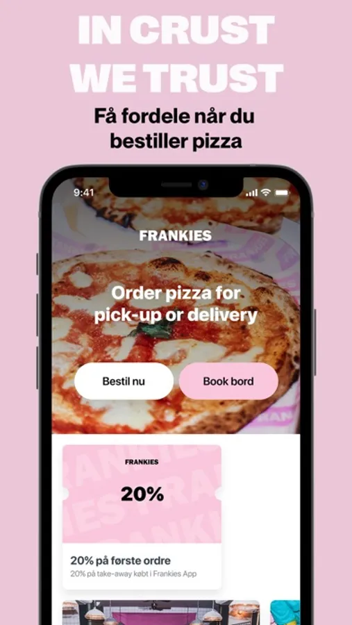Med Frankies app’en kan du altid finde din nærmeste Frankies restaurant, bestille pizza samt få nyheder om fordele og events.