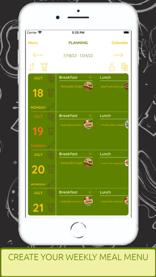 With this application you can easily create the weekly planning of all the meals you want for the day (breakfast, lunch, dinner...). To do this you will have to create the recipes of your favorite meals adding all the information you want (ingredients, category, steps, cooking time...), and assign them to the meals of the day and of the week. You can also create the shopping list automatically.