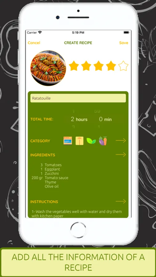 - Create your recipes, add the name, cooking time, category, ingredients, instructions, a photo, and even extra notes and a star rating.