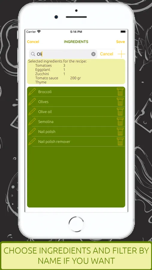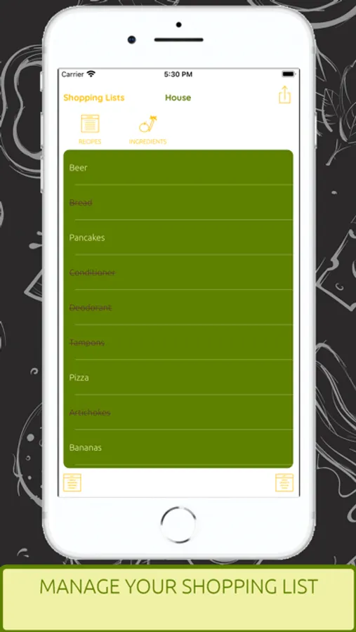- Mark purchased ingredients by tapping on them, or remove them by swiping left.