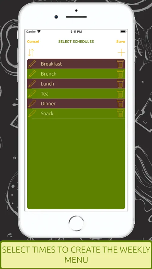 - Create the weekly menu by pressing the '+' button and selecting the schedules you want for the day (you can create new schedules and reorder them).