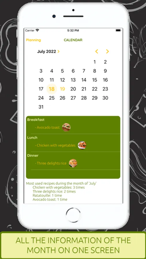 - See the planned meals of the week or the whole month, and the most used dishes of the month.