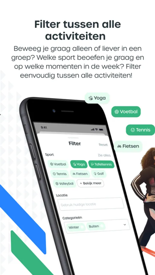 Om het zoeken van jouw volgende activiteit zo makkelijk mogelijk te maken, kun je zoeken op verschillende sport en beweeg categorieën en filteren tussen alle activiteiten.
