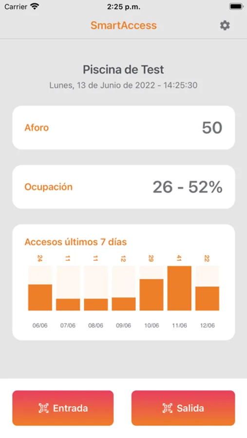 La pantalla principal ofrece información general sobre el recinto: aforo, ocupación, ocupación de los últimos 7 días...