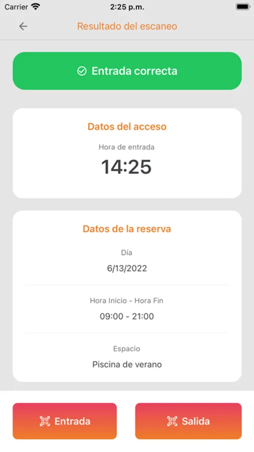 Una vez escaneada la entrada el sistema ofrece toda la información relacionada con la reserva y el usuario, para poder autorizar de manera correcta el acceso.