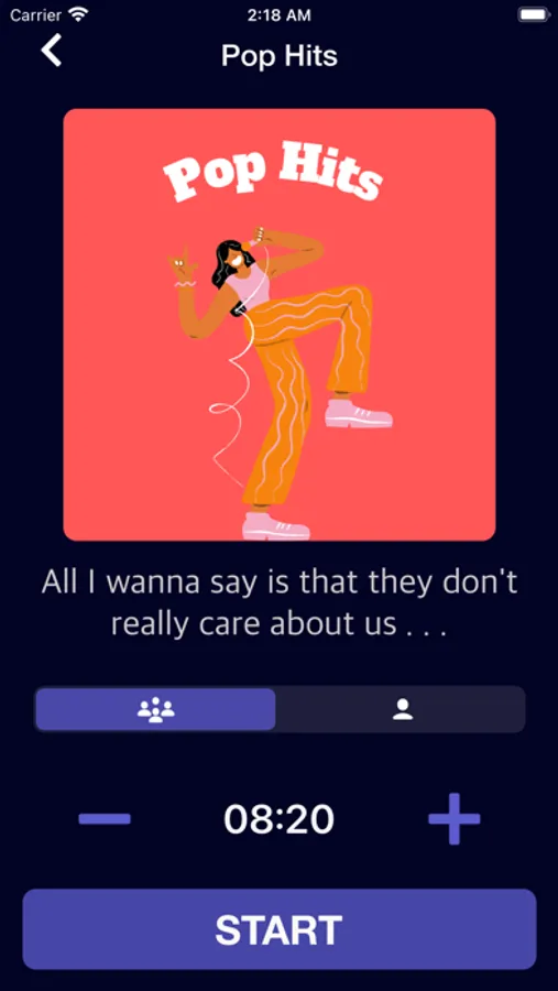 Pick a category that you would like to play, press the multiplayer icon, then choose the duration of the game and press “Start”. 3, 2, 1! GO! Sing the song displayed on the screen or guess from your friends' singing. Got a song correctly? Swipe down on any part of the screen and keep up the pace. Don't know the song? Swipe up and move on to the next one. Most importantly have as much fun as you can!