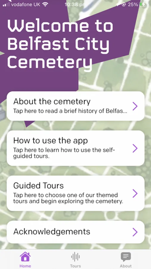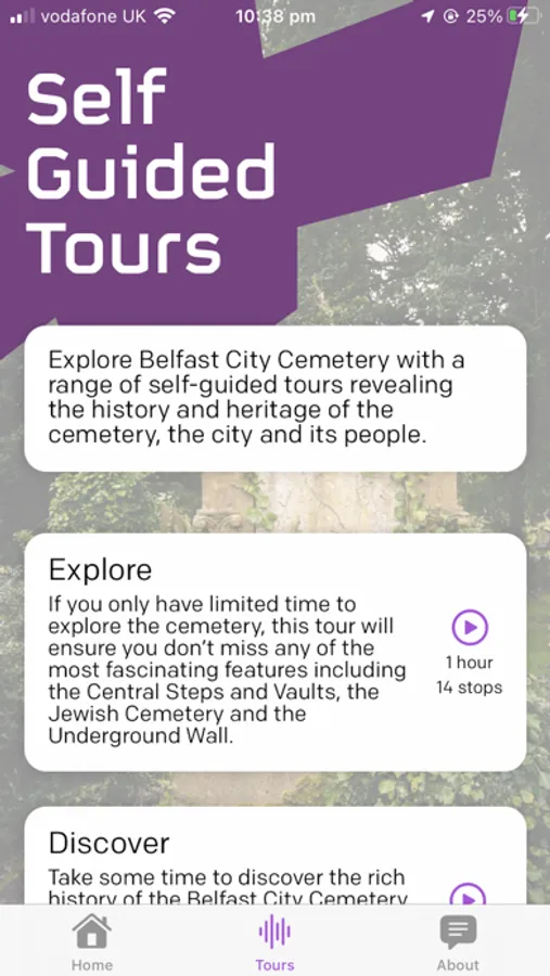 The Belfast City Cemetery App is your virtual tour guide for exploring the cemetery. It contains a wealth of multimedia content covering the history of the cemetery, and the people buried there. A selection of tours will educate you about some of the figures that shaped the cultural, industrial and military history of Belfast. It uses GPS to tell you exactly which features of the cemetery are near you, and to deliver multimedia content to enhance your visit.