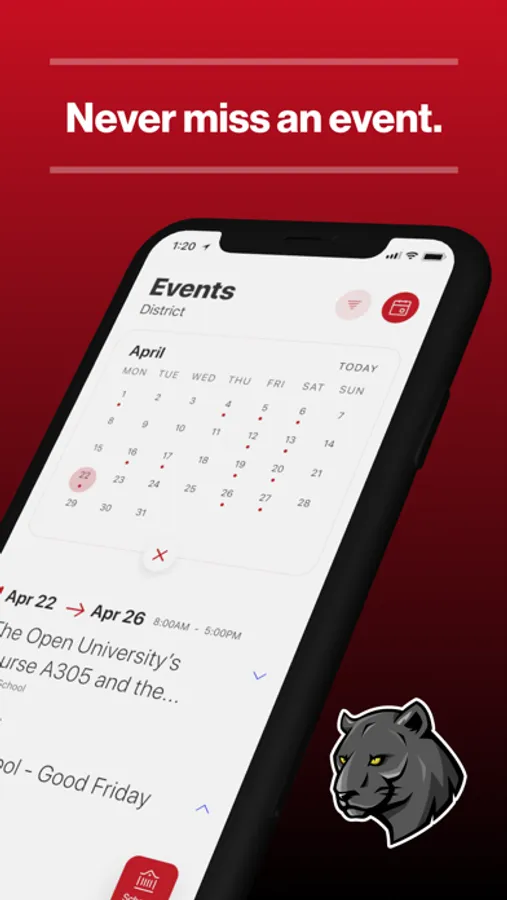 The event section shows a list of events throughout the district. Users can add an event to their calendar to share the event with friends and family with one tap.