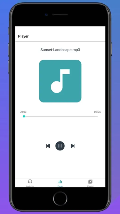 Using bottom navigation in the bottom of the app you can navigate to other screen of the app like player and playlist screen. Player screen of the app has all essential features of a audio player like play/pause, next, previous, and status bar which can be also use to foreword and backward the audio