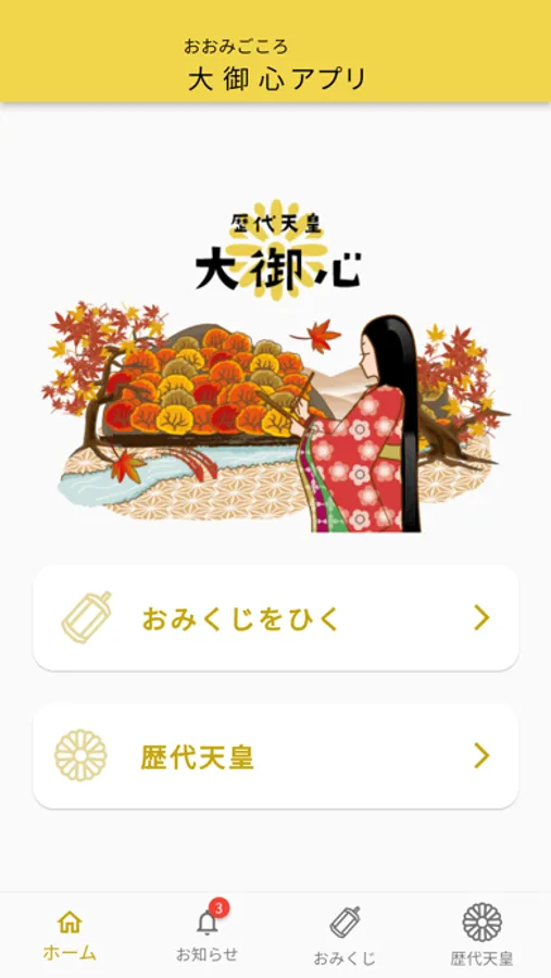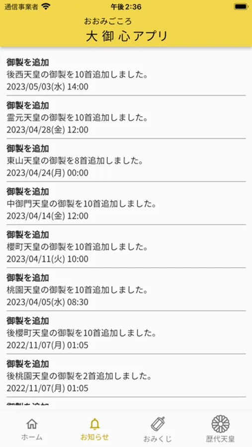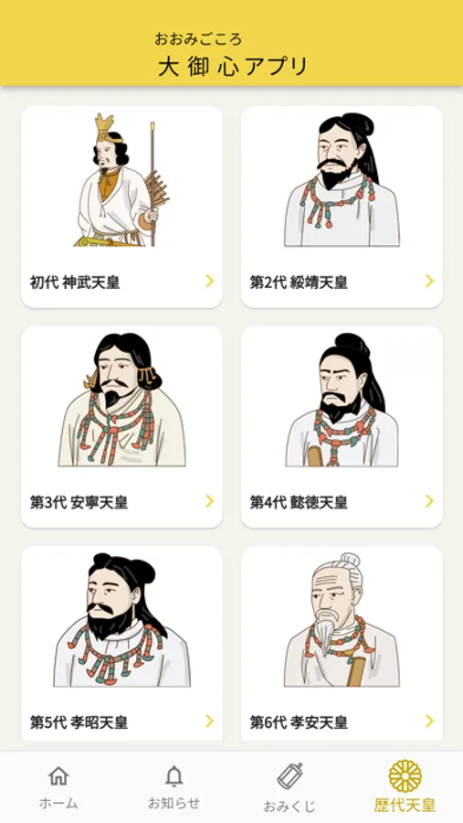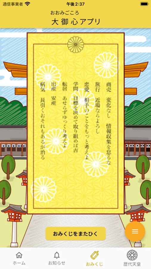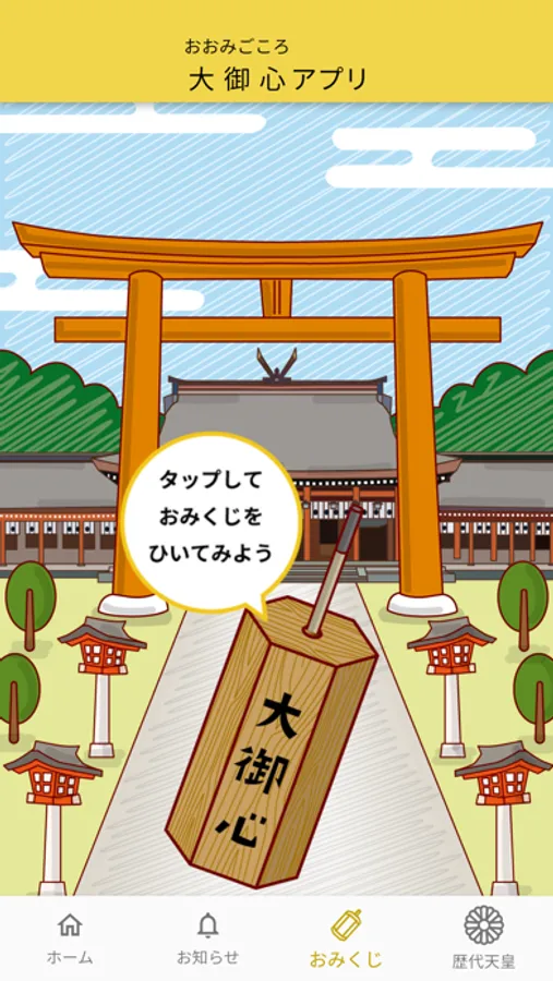 歴代天皇の御製(=天皇が詠んだ和歌)をおみくじにしたアプリ。