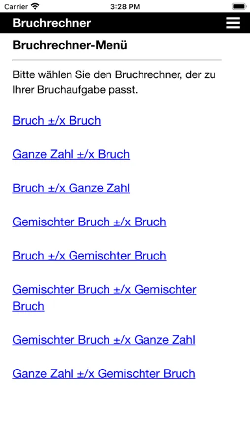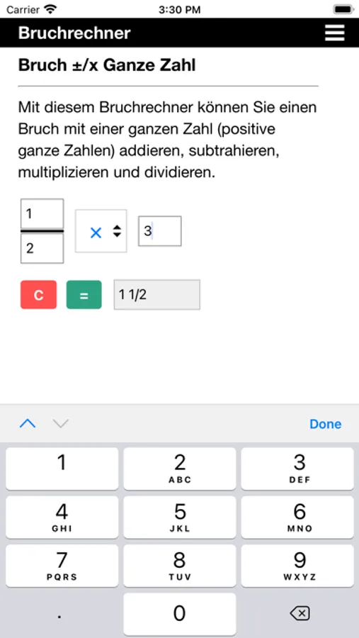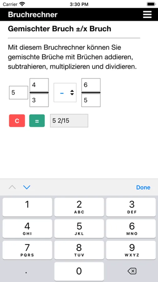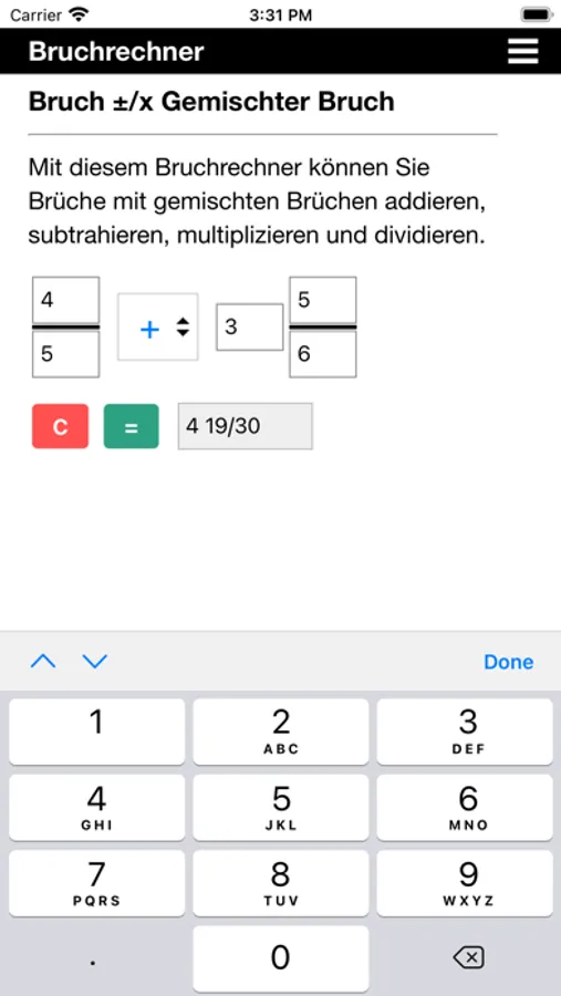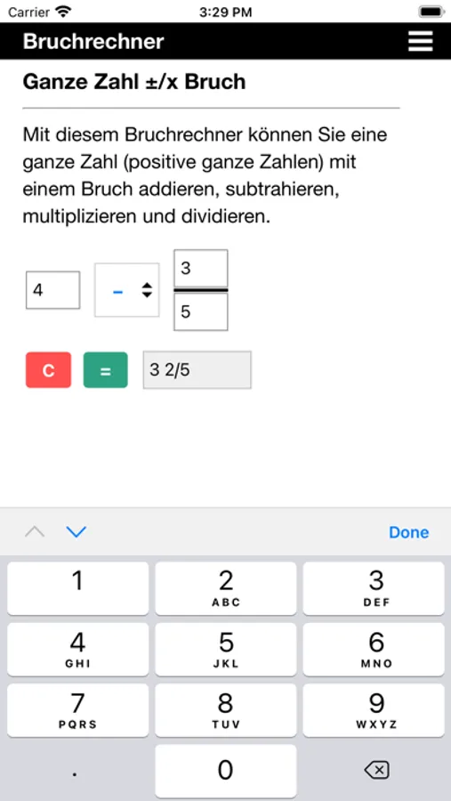 Diese App kann Brüche addieren, subtrahieren, multiplizieren und dividieren. Sie kann alle Arten von Brüchen verarbeiten: echte Brüche, unechte Brüche, gemischte Zahlen und natürlich ganze Zahlen.