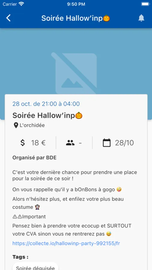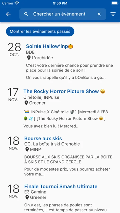 Cette application permet de voir les événements qui arrivent prochainement avec toutes les infos utiles et les liens. Elle permet aussi chercher un événement précis et de trier les événements en fonction de différents critères.