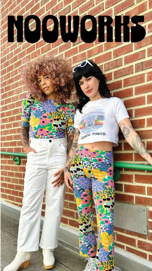 Nooworks is a woman owned, women run business. We make limited edition textiles with artists we love in cuts to make you look and feel good. All our garments are produced in California. We try to source all our materials in the USA and work with incredibly nice people.