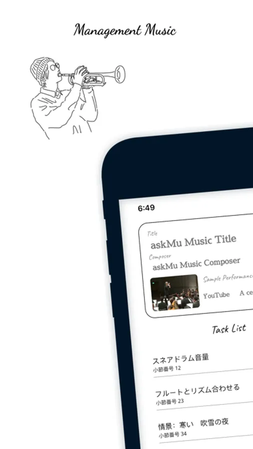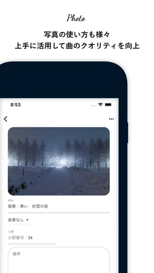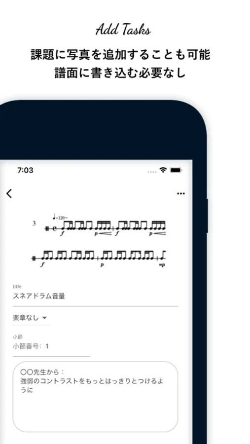 ・各課題に写真追加可能(譜面の写真 or 景色の写真などを使用して曲のイメージを膨らませるなど用途は様々)