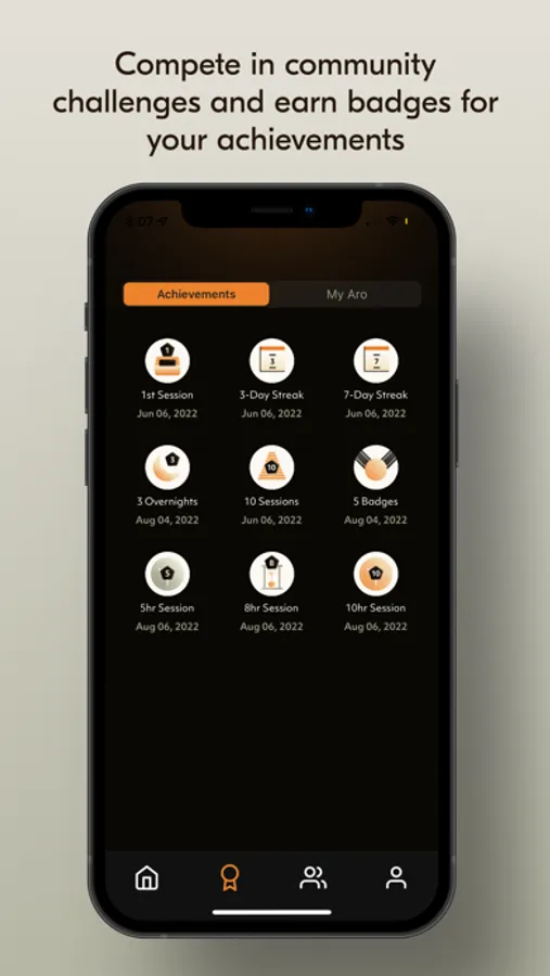 Compete in Challenges and Earn Badges: Hitting your goals and building new habits is easier when it's fun and rewarding. Compete against yourself or the Aro community to earn badges and achievements.