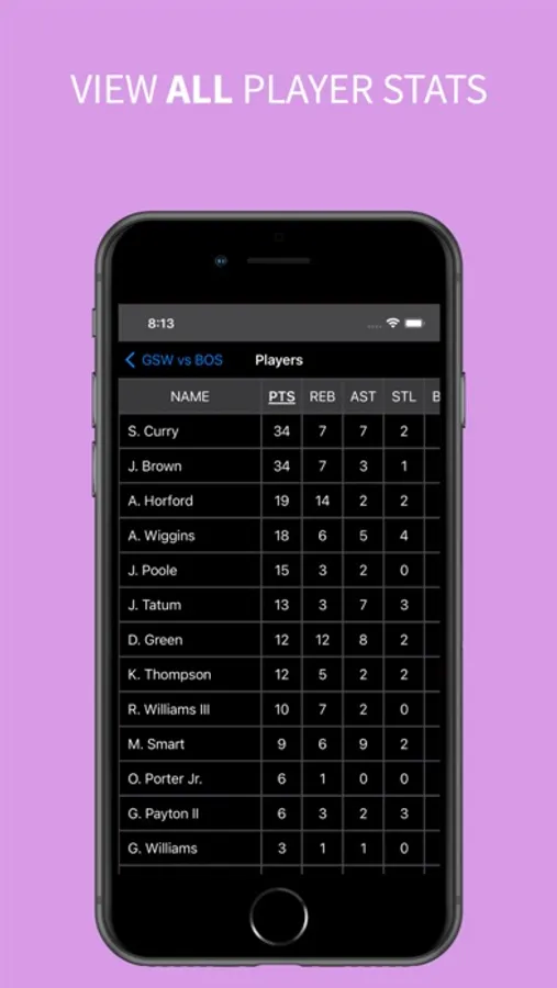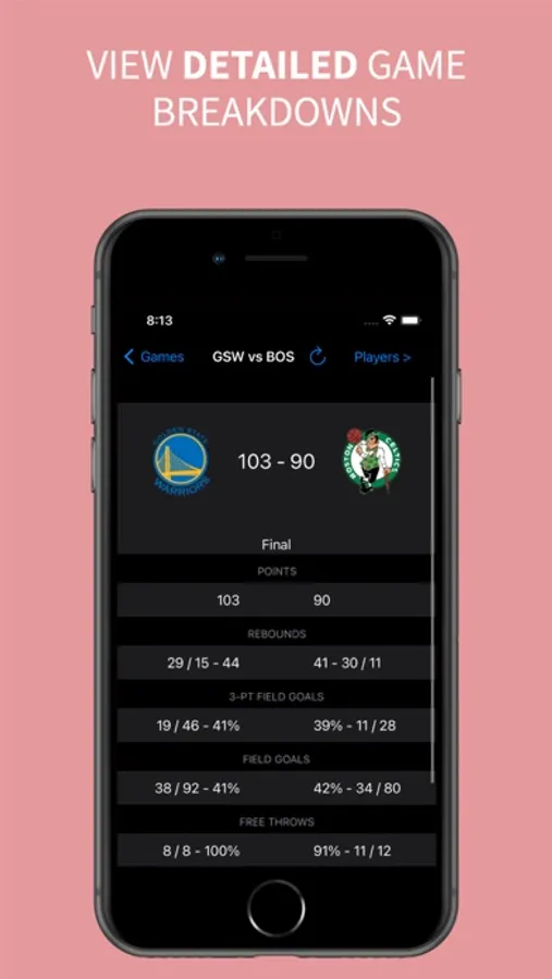 View live games, available upcoming game and past games with ease. Select any game to view a detailed game breakdown of each team, view player stats and full player breakdowns.
