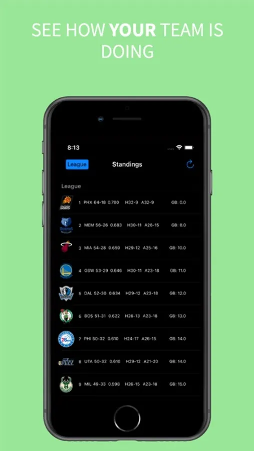 View the NBA's current standings, with sorting options and the ability to view a team's detailed season breakdown.