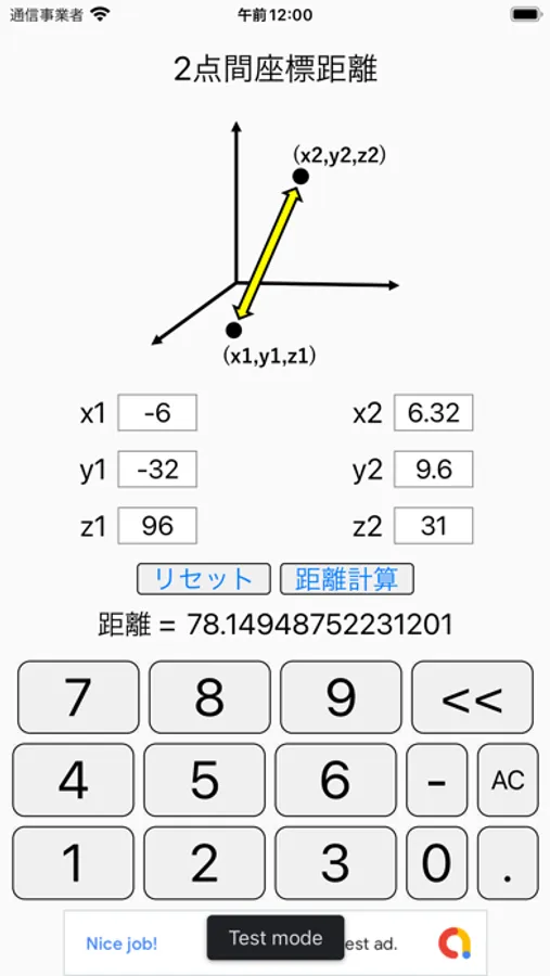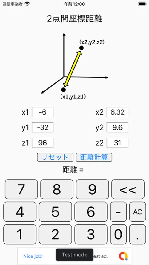 xyz座標を入力して距離計算ボタンを押すだけで距離が求まります。