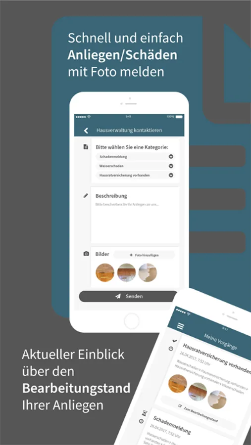 Als Mieter oder Eigentümer können Sie Schäden oder Anliegen direkt mit Fotos über unsere App melden. Ihre Anfragen stehen unseren Mitarbeiten dann zur Verfügung und können auch an Handwerksbetriebe weitergeleitet werden.