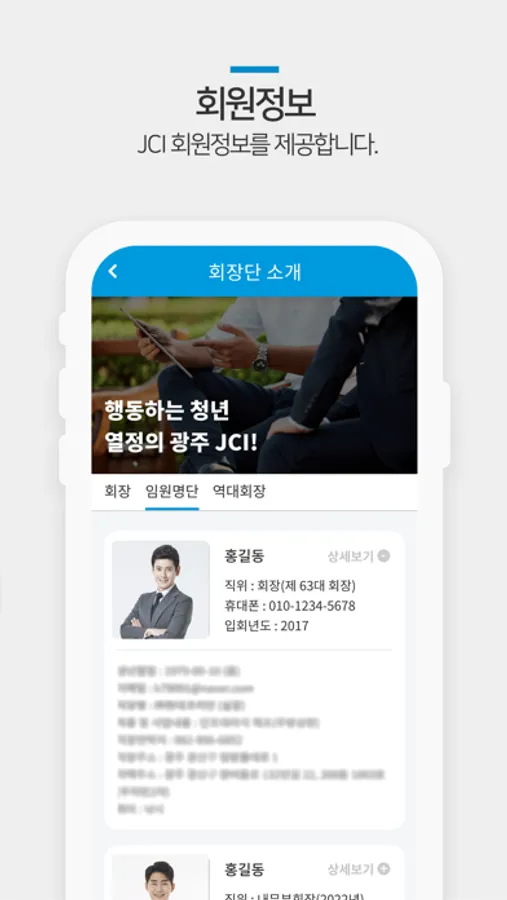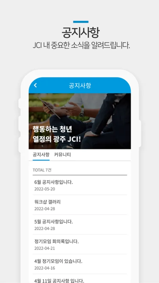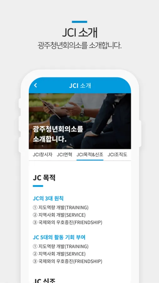 광주JC회원 및 특우회원의 JC활동을 돕기 위한 어플리케이션으로 사업 정보 및 알림서비스, 회원정보 등 다양한 정보를 제공합니다.