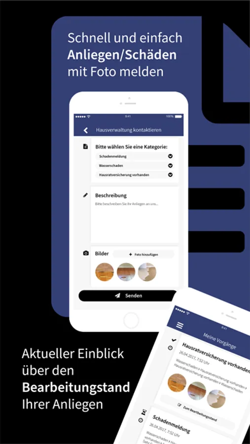 Als Mieter oder Eigentümer können Sie Schäden oder Anliegen direkt mit Fotos über unsere App melden. Ihre Anfragen stehen unseren Mitarbeiten dann zur Verfügung und können auch an Handwerksbetriebe weitergeleitet werden.