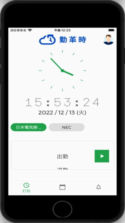 従業員用アプリでは出退勤の打刻ができます。打刻した時刻、場所の情報は「勤革時」側に送信されます。