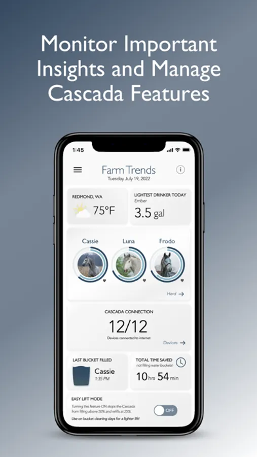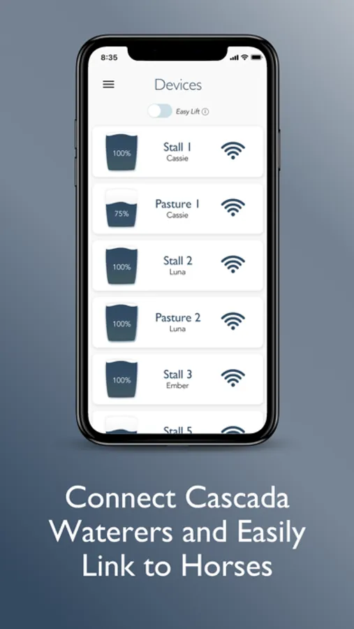Always know how much your horse is drinking! Connect your Cascada automatic waterer using the Cascada app and conveniently track hydration and drinking trends from anywhere in the world. Easily check on your horse’s water consumption and bucket water level, compare behavior with historical data, and receive helpful notifications designed to keep you updated on your horse’s health.