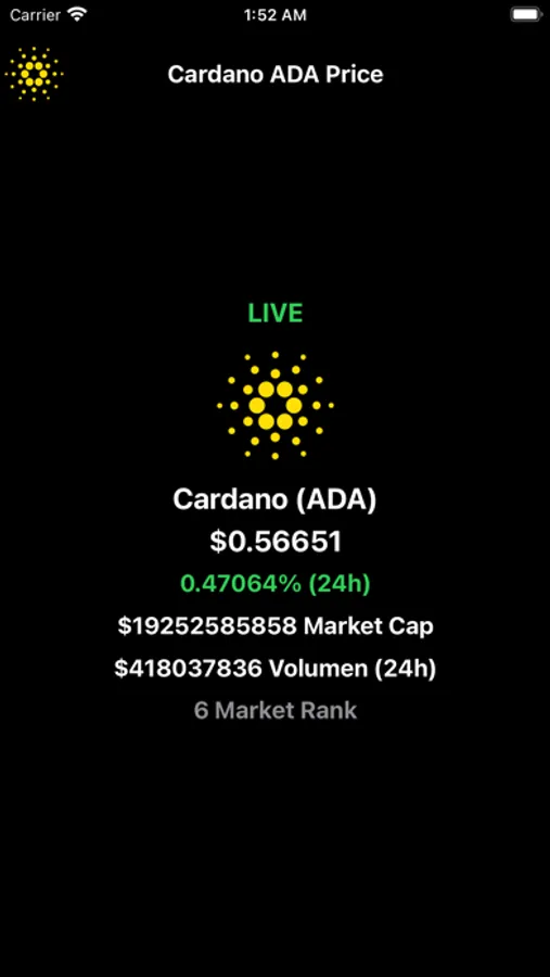 - Additional information such as total market capitalization, volumen and market rank of the coin.