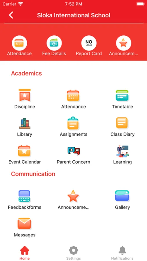Sloka international school provides communication app for parents using which they can download school announcements, Class assignments, Events.