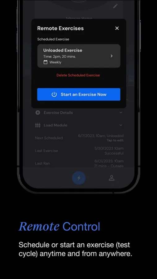Schedule or start an exercise (test cycle) anytime and from anywhere with the KOHLER® Energy Management App. Test cycles are key to ensure your generator is ready to go when you need it most, and the app makes it easier with remote control.