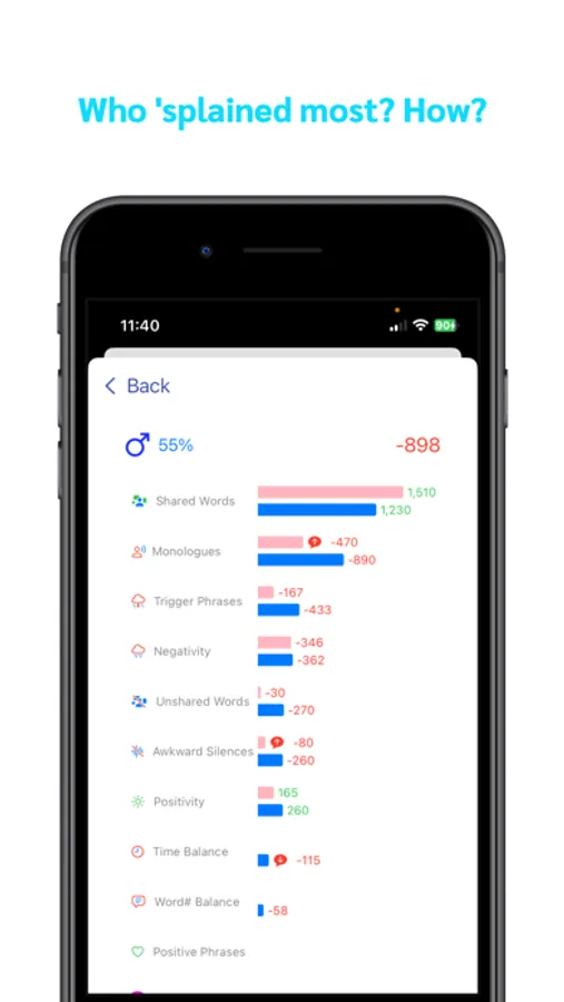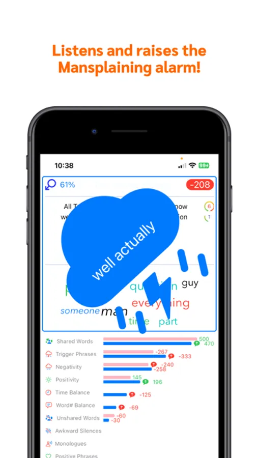 Listen for mansplaining by Gender and Raise the Alarm! SplainBrain's speech recognition detects mansplaining phrases like "Well, Actually", raises the alarm, and can even generate a fake phone call to provide escape. Detects monologues, awkward silences, unshared topics, negative speech and other mansplaining characteristics! Our AI was by trained 150,000+ voice clips to identify male and female speech. You'll know who 'splains the most!