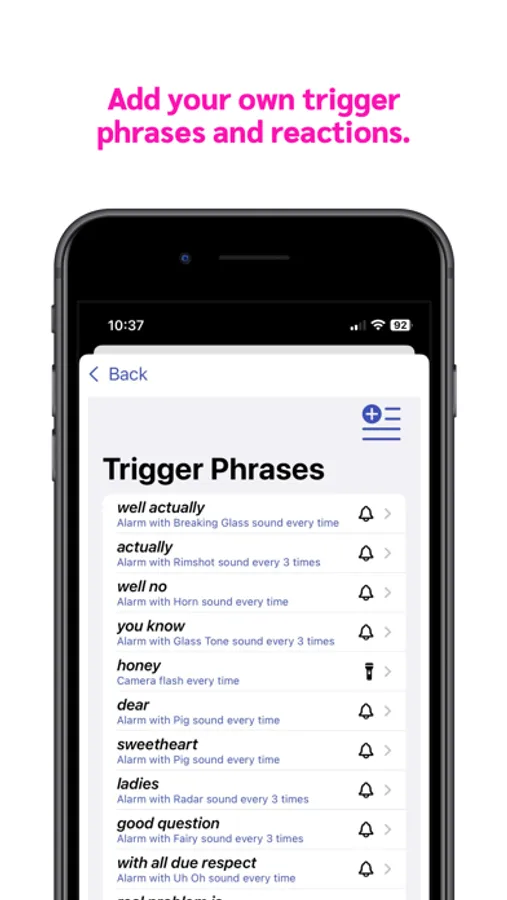 Customizable: Configure SplainBrain to track the words or phrases you want, and react with alarms, flashing, a fake call - or just silently collect stats.